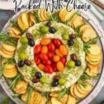 A round cheese and herb spread is garnished with tomatoes and olives, surrounded by crackers and rosemary sprigs on a glass plate.