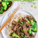 A plate of beef and broccoli stir-fry served over white rice, garnished with sliced green onions, with chopsticks placed on the side—perfect for those seeking simple dinners and satisfying dinners alike.