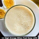 High-protein smoothie in glass on white saucer with hard boiled eggs cut in half.