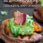 Crispy sweet potato bites are topped with creamy guacamole and a salty piece of bacon. Perfect for appetizers, snacks, or party finger food. Sweet, savory, and flavorful in every bite.