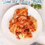 A white plate with stuffed pasta shells topped with tomato sauce and melted cheese, garnished with a sprinkle of herbs.