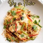A plate of stir-fried vermicelli noodles topped with two pieces of omelette, garnished with cilantro and sliced green and red peppers, brings bold flavor and inspiration for plant-based cooking.