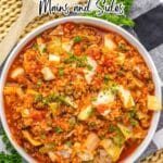 A bowl of unstuffed cabbage roll casserole with ground meat, cabbage, and tomato sauce, garnished with parsley—a perfect comfort food option among cabbage dishes, served on a woven placemat with a wooden spoon nearby.