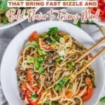 A bowl of stir-fried noodles with ground meat, sliced red and yellow bell peppers, green onions, and cilantro offers bold flavor. Chopsticks rest on top, with a small bowl of sliced peppers beside it—perfect inspiration for new stir fry recipes.