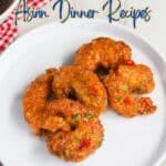A white plate with four breaded and sauced shrimp, a bowl of shrimp, a red checkered cloth, and a bowl of dipping sauce on a white surface—perfect for Asian dinner recipes featuring bold spices and balanced flavors.