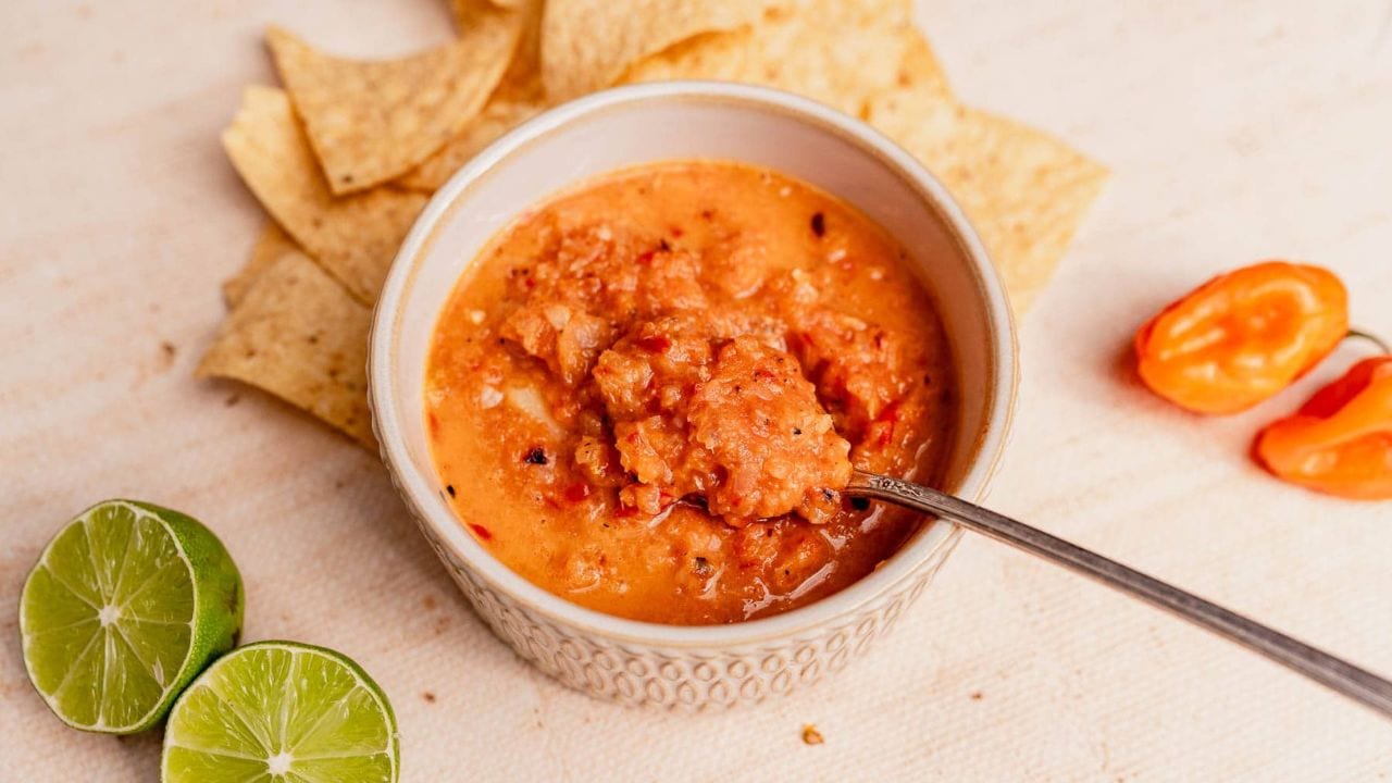 Habaneros blended with tomato, onion, and lime for a fiery red salsa that hits hard. It’s smooth, bright, and better in small scoops. Serve with caution but don’t skip it. A bold one for spice lovers.